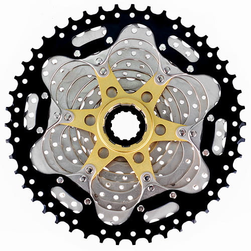 • kaseta do napędów 10 rzędowych • zakres: 11-46Z • stopniowanie: 11, 13, 16, 20, 24, 28, 32, 36, 42, 46Z • materiał: zębatki stal (Q195), pająk aluminiowy • wykończenie: nikiel, czarny, pająk złoty • waga: 629g • pakowanie: ProX box (465g)