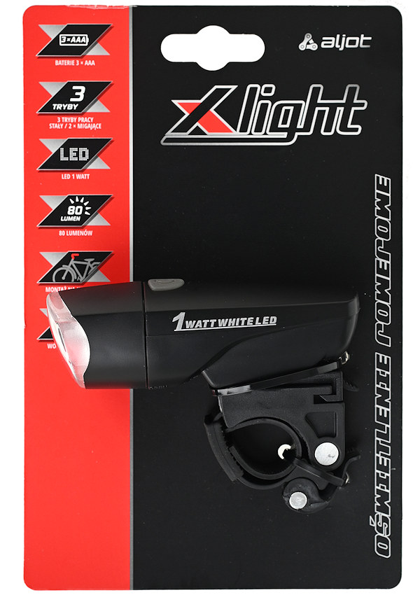 • lampa przednia na baterie • super jasna dioda Led • moc świecenia: 80 Lm (1 Watt) • 3 tryby świecenia: stały, 2 xmigające • zasilanie: baterie 4 x AAA (w komplecie) • obudowa z tworzywa, wodoszczelność klasy: IPX3 • wielkość: 102 x 35 x 36 mm, waga: 91g • w komplecie uchwyt do montażu na kierownicę • pakowanie: zawieszka X-Light (132g)