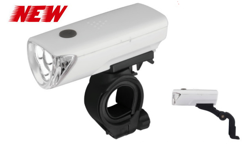 • lampa przednia • 3 super jasne diody LED, Moc 25 Lm. • w komplecie uchwyt do montażu na widelcu • 3 tryby świecenia: stały, 2 x migajace • baterie 3 x AAA (w komplecie) • pakowanie: blister, waga 70 g.