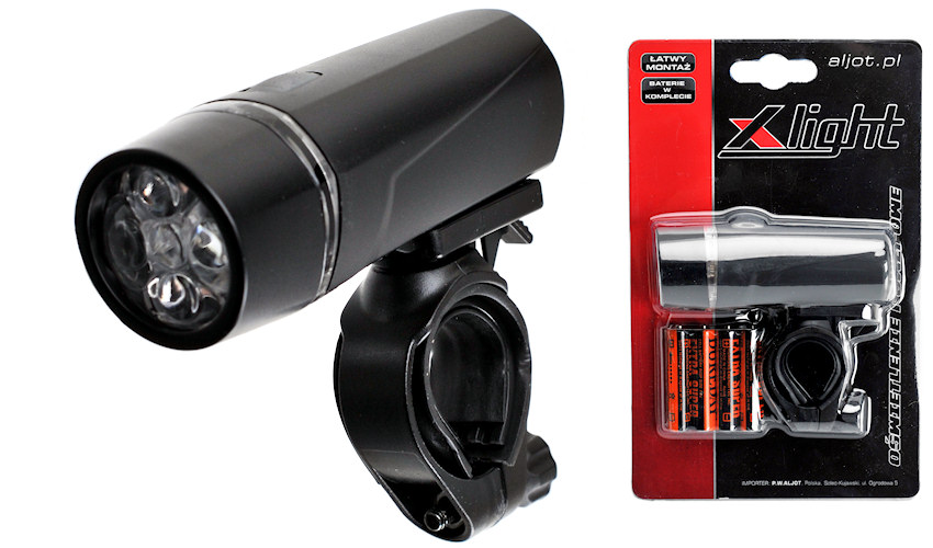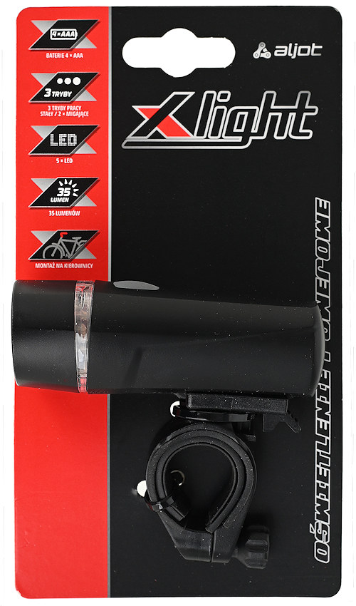 • lampa przednia na baterie • 5 super jasnych diod LED • moc świecenia: 35 Lm • 3 tryby świecenia: stały, 2 xmigające • zasilanie: baterie 4 x AAA (w komplecie) • obudowa z tworzywa, wodoszczelność klasy: IPX3 • wielkość: 96 x 34 x 34,5 mm, waga: 91g • w komplecie uchwyt do montażu na kierownicę • pakowanie: zawieszka X-Light (109g)