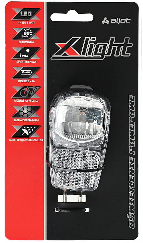 • lampa przednia montowana do widelca • przełącznik On/Off • dioda Led 1 W, moc świecenia: 60 lm • klosz z odblaskiem • konstrukcja klosza nie oślepia kierowców • stały tryb pracy • zasilanie: baterie 2 x AA (w komplecie) • obudowa z tworzywa, wodoszczelna IPX3 • długość uchwytu mocującego: 55 mm • waga: 79 g • pakowanie: zawieszka X-Light (89 g)