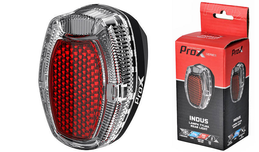 • lampa rowerowa tylna typu E-BIKE • typ diody: 4 X SMD, moc 8 Lux • tryby pracy: światło główne, światło hamowania • zasilanie: DC 12-80V • obudowa: tworzywo ABS/PC, z odblaskiem • wodoszczelność klasy: IPX4 • wymiar: 60,5 x 43 x 43 mm. Waga: 45 g. • lampa montowana błotnika, za pomocą śruby • przewody o długościach: 150/90 mm, połączone złączką • pakowanie: ProX box (waga 119 g)