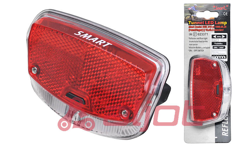 • lampa tylna mocowana na bagażniku • 1 super jasna dioda LED • tunelowe podświetlenie LED • na baterie 2 x AAA • przełącznik ON/OFF • rozstaw śrub do montażu : 80 mm • waga 100 g.