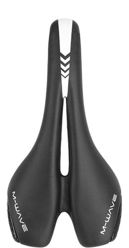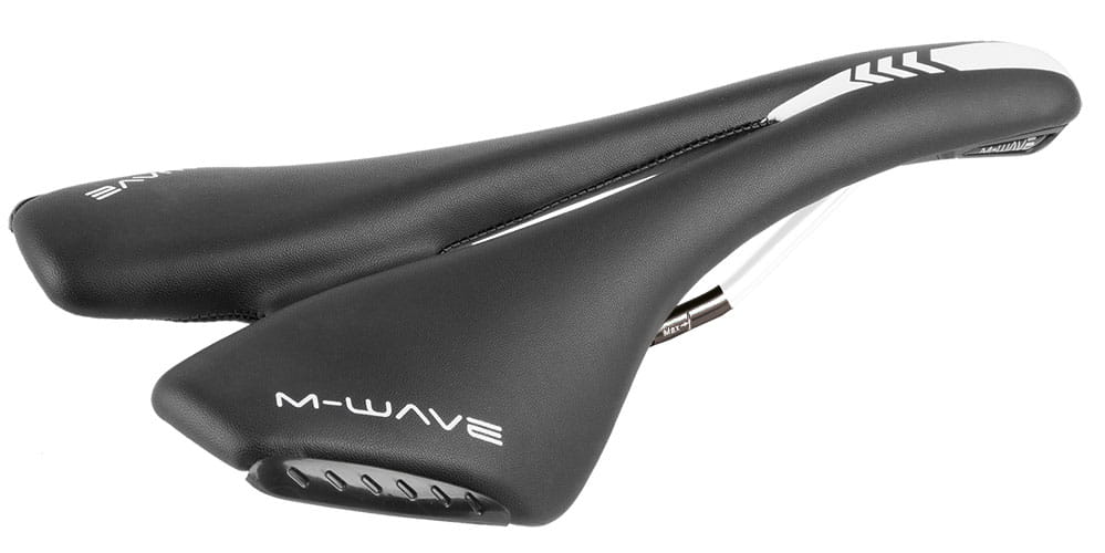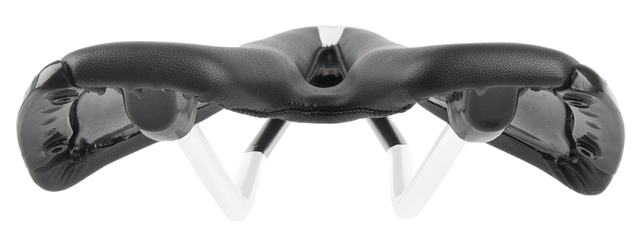 • siodełko sportowe, MTB • V-Design • otwór w konstrukcji siodełka poprawiający komfort • wypełnienie: Litht foam – lekka pianka • boczne wzmocnienia • materiał pokrycia: PU • materiał prętów: CrMo z podziałką (Biało-Czarne-Białe) • wymiary: 280 x 144 mm • waga: 312 g